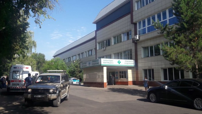 17.41. Центральная городская клиническая больница на Манаса, куда экстренно доставили фигуриста. Здесь также стоят полицейские машины. Здесь же находятся родные и близкие Дениса Тена.