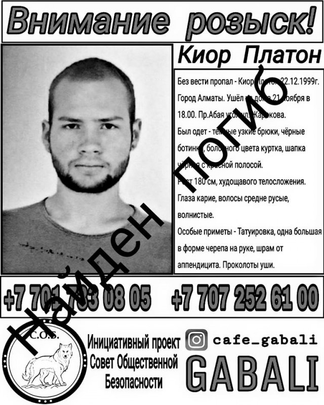 "У близкой подруги пропал сын. Платон Киор. Ушел из дома в шесть вечера 21 ноября в районе улиц Абая - Жарокова, был одет в темные узкие брюки, болотного цвета длинную куртку-пуховик, черную шапку с красной полоской и черные ботинки. Рост 180 сантиметров, худощавого телосложения, глаза карие, волосы темно-русые, волнистые. На теле несколько татуировок, самая заметная - на правой руке в виде черепа.