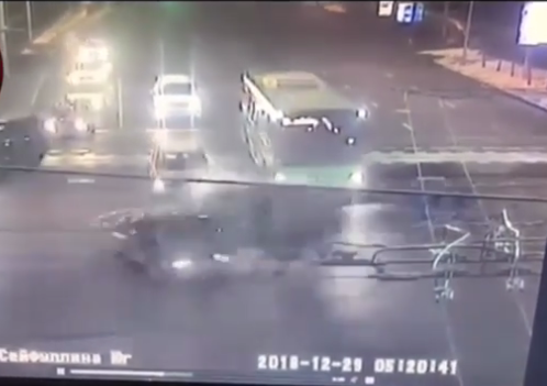 Судя по видеокадрам, Mitsubishi Galant начал движение по Сейфуллина в южном направлении на разрешающий сигнал светофора. В какой-то момент в легковушку на полном ходу врезался Mercedes Gelandewagen. От удара Mitsubishi Galant отлетел на несколько метров.