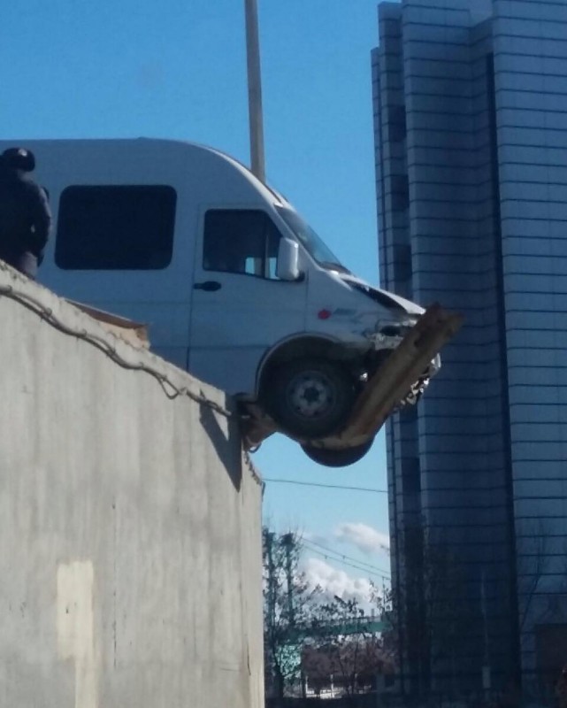 От сильного удара транспортное средство развернуло поперек моста и вынесло за ограду. Каким-то чудом машина удержала равновесие и осталась на мосту.