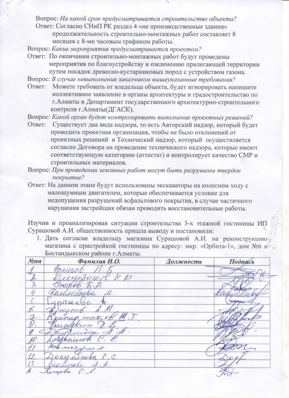 В июле там начали огораживать территорию, прилегающую к территории двора. "Естественно, мы подали заявления во все инстанции: районную прокуратуру, ГАСК, районный и городской акиматы, а также написали депутату. После проверки выявилось нарушение, что отсутствует согласие жильцов на строительство объекта. (...) Мы провели собрание жильцов и единогласно высказались против строительства", - рассказала собеседница.