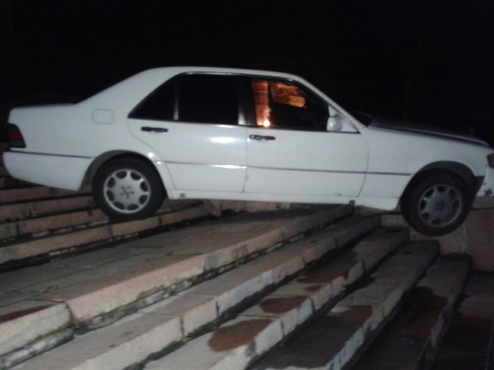 Инцидент произошел по улице Казыбек би, между проспектом Абылай хана и улицей Панфилова. В ходе распития спиртных напитков молодой человек решил съехать на своем автомобиле вниз по лестнице, в результате чего он протаранил лестницу и застрял. Отметим, что парковочная площадка у здания КБТУ на Старой площади является местом частого скопления молодежи.