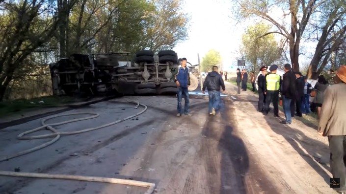 Вечером 13 апреля близ Алматы перевернулся бензовоз с цистерной на прицепе. В результате инцидента дорогу тут же залило горючим (дизельным топливом), но пожара и взрыва удалось избежать. Об этом изданию Kolesa.kz рассказал один из очевидцев.