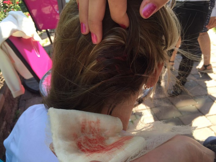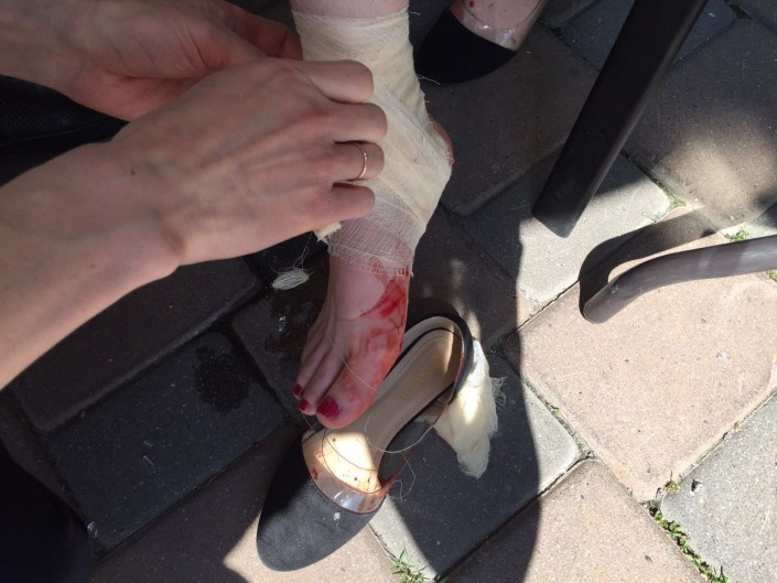 ЧП произошло 17 августа во втором часу дня возле кафе-бара "Odysseya". "Мы сидели за этим самым столиком, нас было четверо. Я получила травму, мне осколок прямо в ногу попал, также в руку, есть ушиб головы, но не очень, только краем. Ходить не могу, хромаю. Глаза не пострадали, потому что были очки. Подружка-коллега сидела, она вот очень пострадала, очень серьезные травмы у нее. Пишут, что не особой тяжести, на самом деле все очень критично, она в больнице. У нее сотрясение, какой-то сосуд повредился. Она прислала мне фотографии, где ей уже зашили голову. Там огромнейшая рана, чуть ли не до костей, до головного мозга. Врачи отправили ее на МРТ", - добавила девушка.