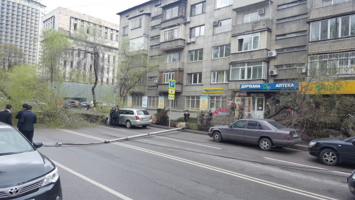 На проезжую часть в центре Алматы упали деревья и электрический столб