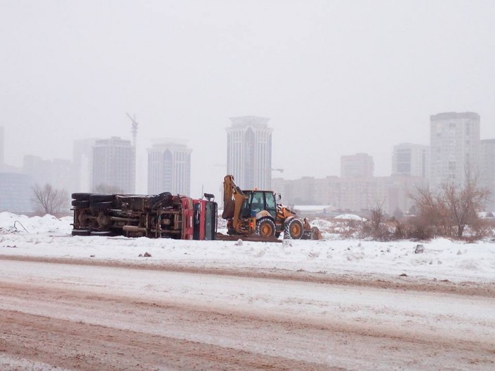 В Facebook на странице Ұлана Әбішева появились фотографии ДТП на улице Нажимеденова в Астане. Столкнулись китайский самосвал Sinotruk Howo и автомобиль KIA. В результате оба транспорта перевернулись.