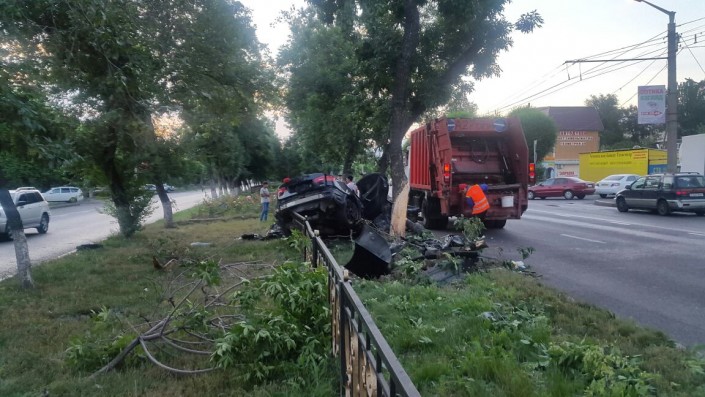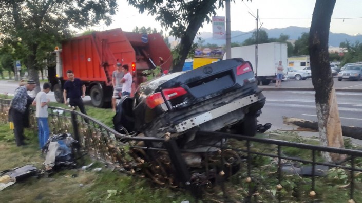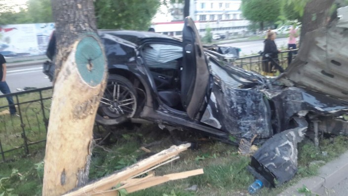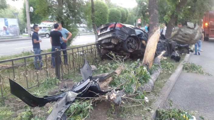Автомобиль марки Lexus IS 350 следовал по проспекту Абая в восточном направлении. На углу с улицей Тургут озала водитель автомобиля не справился с управлением и допустил наезд на бордюр, в результате чего пробил колесо, вылетел на разделительный газон и сбил два дерева.