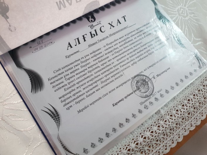 В фойе школы организовали уголок памяти. Рядом с фотографией Такирхана Абишева папка с многочисленными благодарственными письмами и грамотами за хорошую работу и победы в различных творческих конкурсах.