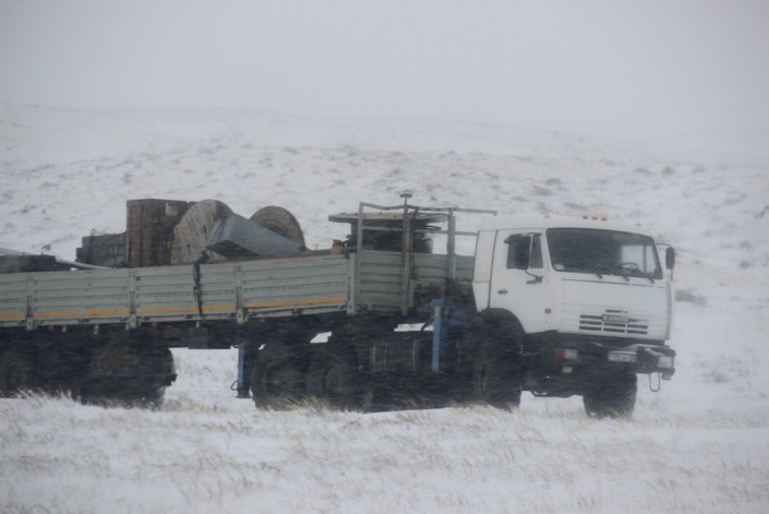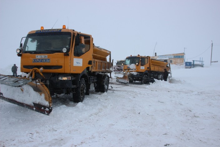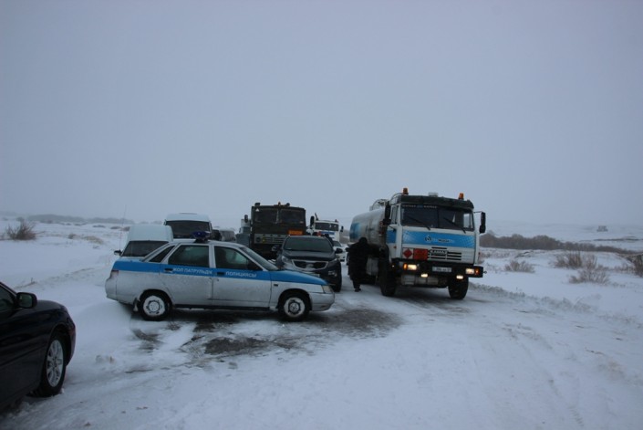 В результате сложных метеорологических условий - метель, сильный ветер, гололед - на автодороге "Алматы - Екатеринбург" на участке "Караганды - Аксу - Аюлы" произошло большое скопление грузового, легкового и пассажирского автотранспорта, следовавшего в направлении Караганды и Алматы.