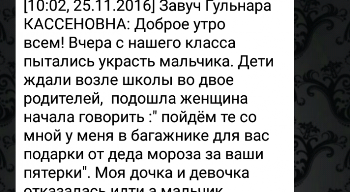 В WhatsApp и социальных сетях распространялась информация, исходящая якобы от завуча школы № 5 Гульнары Кассеновны: "Вчера с нашего класса пытались украсть мальчика. Дети ждали возле школы во двое родителей, подошла женщина начала говорить :" пойдем те со мной у меня в багажнике для вас подарки от деда мороза за ваши пятерки". Моя дочка и девочка отказалась идти, а мальчик пошел. Только благодаря тому, что девочки стали плакать и кричать "не ходи", их услышали и побежали за женщиной, та бросила ребенка и убежала, за углом ждала машина" (орфография и пунктуация сохранены).