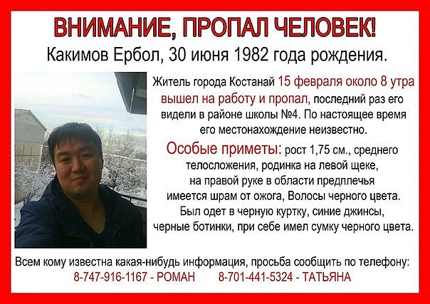 35-летний Ербол Какимов, являющийся сотрудником костанайского онкологического диспансера, пропал после того, как отвел сына в школу, сообщает Alau.kz.