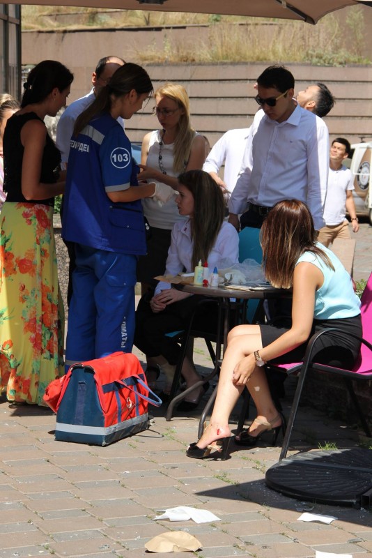 "На девушку, обедающую за столиком в летнике, упала масса стекла. Оказывается, посыпался верхний слой окна на верхнем этаже ЖК "Нурлы Тау". Бедная девушка пострадала серьезно: голова в крови и ноги тоже. Приехала "скорая" и по пути увидели спешащего туда же участкового. Люди, не ходите и не стойте вблизи стеклянных зданий. Опасно, выходит, для жизни и здоровья", - написала на своей странице в Facebook одна из очевидцев Zhanna Oishybayeva.