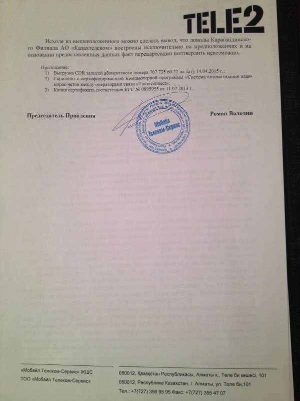 Они также пояснили, что после звонка на номер 112, который закончился в 11:52:06, абонент не совершал больше никаких действий (звонков, сообщений - прим. автора). Следующий исходящий звонок был зафиксирован в 13:24:08. Согласно системе взаиморасчетов между операторами связи Tele2 оплатил "Казахтелекому", который обеспечивает работу номера 112, шесть секунд голосового вызова. К письму компания приложила необходимые сертификаты.
