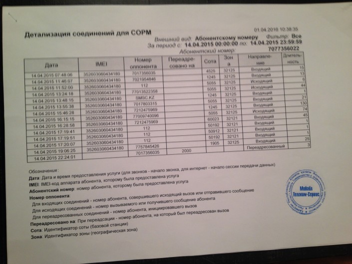 Адвокат подсудимого Сергей Ким написал официальный запрос в компанию Тele2 и попытался выяснить, может ли звонок автоматически переадресоваться на другой номер и при этом быть не зарегистрирован сотрудниками сотовой связи. Из ответа Tele2 следует, что такого быть не может. "14 апреля в 11:52:00  с номера абонента был зафиксирован один исходящий звонок на номер 112, который длился шесть секунд. Затем звонок был прерван, о чем свидетельствуют записи с CDR компании и с телефона абонента. Тем самым никакой переадресации после разрыва соединения быть не могло", - написали в ответе сотрудники компании.