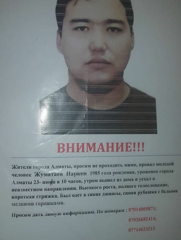 "23-го он приехал в Алматы из Кокшетау, куда поступил на учебу. Оставил вещи и вышел из дома в 10 утра. С тех пор его никто не видел. Ни друзья, ни коллеги по работе не знают. С 23 по 25 июля, когда ему звонили, шли гудки. Потом телефон был отключен. С тех пор никаких вестей", - рассказывает Берик Ергазин.