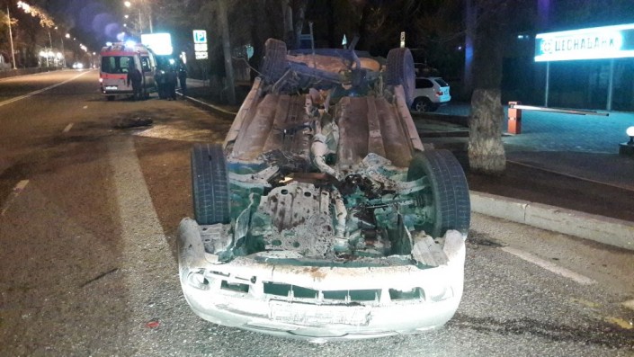 ДТП произошло на пересечении проспекта Назарбаева и улицы Макатаева. Со слов очевидцев, Nissan на полном ходу попал колесом в люк и перевернулся на крышу.