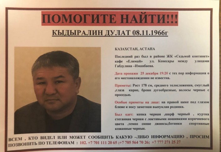 "Полицейскими проводится комплекс оперативно-розыскных мероприятия, направленные на установление местонахождения без вести пропавшего Д.Кыдыралина. На поиски ориентирован личный состав и задействованы силы и средства ДВД Астаны и военнослужащих Национальной гвардии МВД РК", - пояснили в полиции.