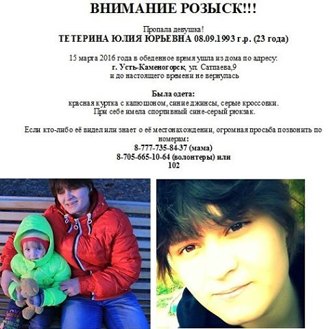 В Усть-Каменогорске уже почти неделю ищут 23-летнюю Юлию Тетерину, сообщает YK-news.kz. Отмечается, что девушка ушла из дома по улице Сатпаева, 9, в полдень 15 марта и до сих пор не вернулась.