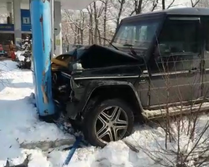Mercedes-Benz во избежание столкновения резко повернул направо, залетел на бордюр, в арык и на полном ходу врезался в стенд автозаправки. В результате два человека были госпитализированы с различными травмами: водитель и ребенок.