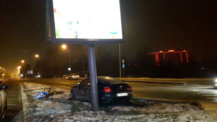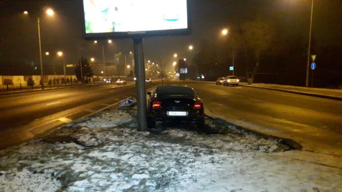 Водитель Bentley двигался по проспекту Сейфуллина в южном направлении. На выезде на проспект Аль-Фараби он не справился с управлением и врезался в столб билборда. В результате аварии никто не пострадал.