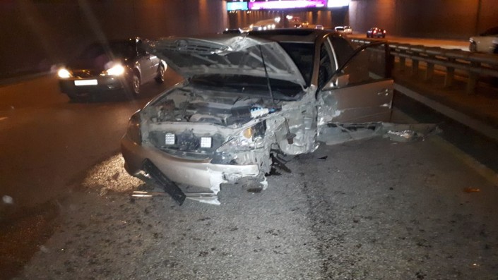 Как утверждают свидетели, в этот момент якобы водитель Mercedes на большой скорости пытался проехать между двумя автомобилями. Однако ему не удалось удачно совершить маневр. "Mercedes задней частью ударятся об Audi, после чего его по инерции откидывает вправо в Toyota. Затем его откидывает в крайний левый ряд, где в это время также в восточном направлении двигалась Toyota Camry. В результате этого и Mercedes, и Camry влетают в отбойник, после чего у них отрывается переднее колесо", - сообщили очевидцы.