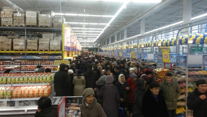 В Актобе местные жители устроили давку на открытии нового гипермаркета "Анвар" по проспекту Нокина. Кадры инцидента, который произошел в среду, 16 декабря, появились на странице zello_aktobe в Instagram.