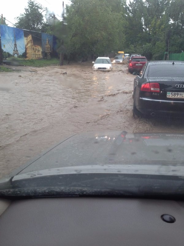 Сегодня из-за сильного ливня на улицах Алматы образовались внушительные потоки воды. В воде оказались автомобили на проспектах аль-Фараби, Абая и Достык. Также сообщается, что вода скопилась под мостом на пересечении проспекта Райымбека и Сейфуллина. По этой причине в некоторых частях города образовались заторы, водой затоплены подземные переходы, тоннели развязок и подземные паркинги. Некоторые автомобили глохли прямо на проезжей части.