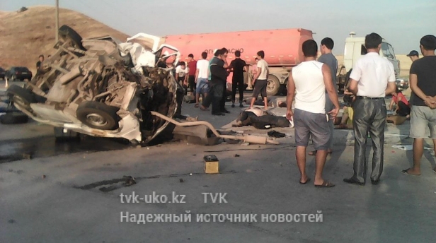 Крупная авария произошла в Южно-Казахстанской области близ поселка Казыгурт вечером в понедельник, 19 сентября. На Ташкентской трассе лоб в лоб столкнулись пассажирский микроавтобус Ford и праворульная Toyota. Пятеро человек (четверо мужчин и одна женщина) погибли на месте, несколько человек пострадали, обе машины превратились в груды искореженного металла, передает телеканал TVK.