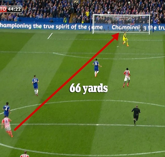 Все произошло в субботнем матче 31-го тура чемпионата Англии. На 44-й минуте игры при счете 1:0 в пользу "Челси" шотландский хавбек, увидев, что голкипер далеко вышел из ворот, пробил с расстояния в 66 ярдов (около 60 метров). Куртуа успел в прыжке зацепить мяч, но снаряд все же попал в сетку.