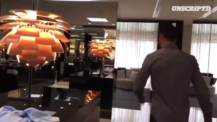 Далее показывает столовую. "Вторая по значимости часть дома - место, где я ем. Чаще всего обедаю и ужинаю дома, именно за этим столом. Мой личный шеф-повар готовит невероятно вкусные блюда. Вот почему так хорошо выгляжу", - смеется он.
