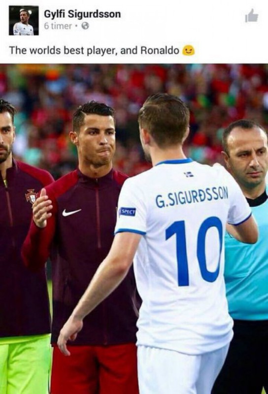 Без "троллинга" Роналду не обходится ни одно событие с участием португальца. Особенно отличился игрок Гульфи Сигурдссон. В своем посте он выложил фотографию с Криштиану Роналду, подписав ее следующим образом: "Лучший игрок мира и Роналду".