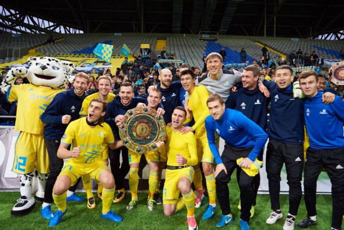Золотые медали чемпионата Казахстана "Астана" завоевала в заключительном туре, в котором со счетом 2:0 победила "Акжайык". Четыре подряд чемпионства стали рекордом среди казахстанских клубов. Фото: пресс-служба "Астаны"