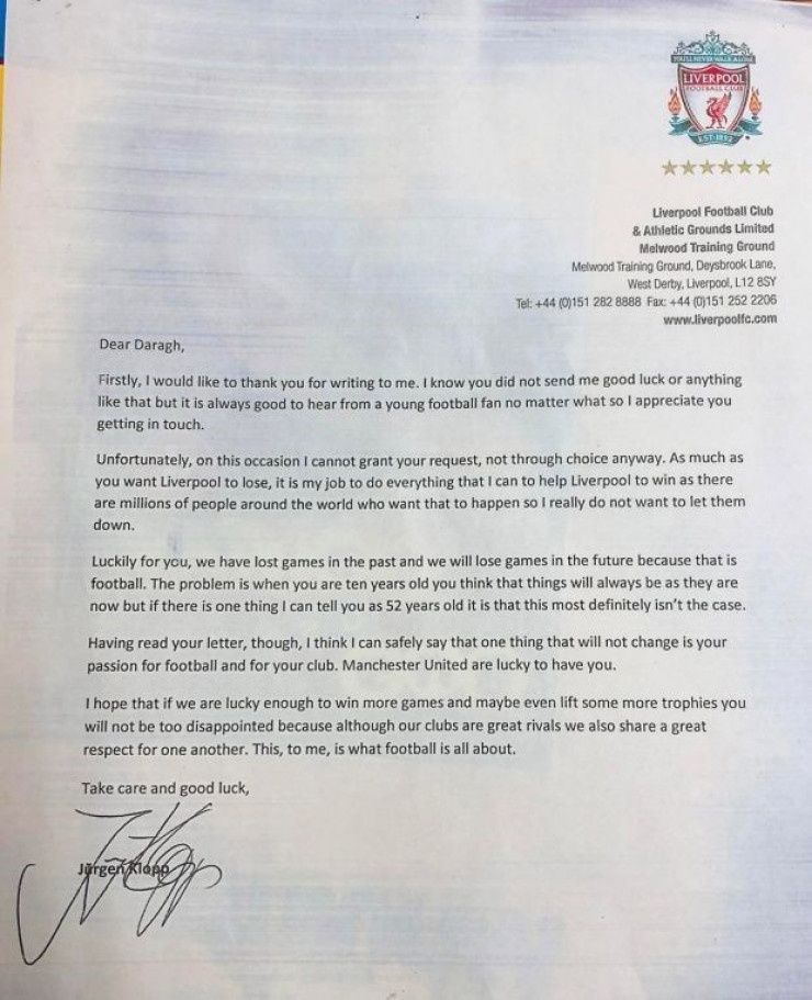 Спустя некоторое время мама мальчика принесла домой ответное письмо, подписанное лично Клоппом. Специалист отметил, что не может пообещать, что "красные" немедленно начнут терять очки.