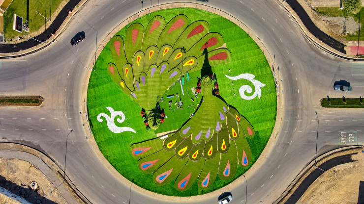 При въезде в город гостей теперь встречает вот такая композиция. Оказалось, это иллюстрация легенды. Как-то раз беременной супруге одного знатного человека сильно захотелось отведать мясо павлина. Но таких птиц в том месте и в помине не было. Тогда муж решил во что бы то ни стало исполнить каприз любимой женщины и провозгласил: кто раздобудет павлина для моей жены, того я награжу золотом или отдам в жены свою дочь.