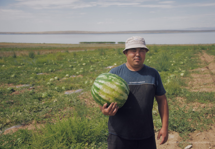 Здесь нас встретили отец и сын - Базарбай и Аян Шарапиевы. Они выращивают арбузы больше 20 лет.