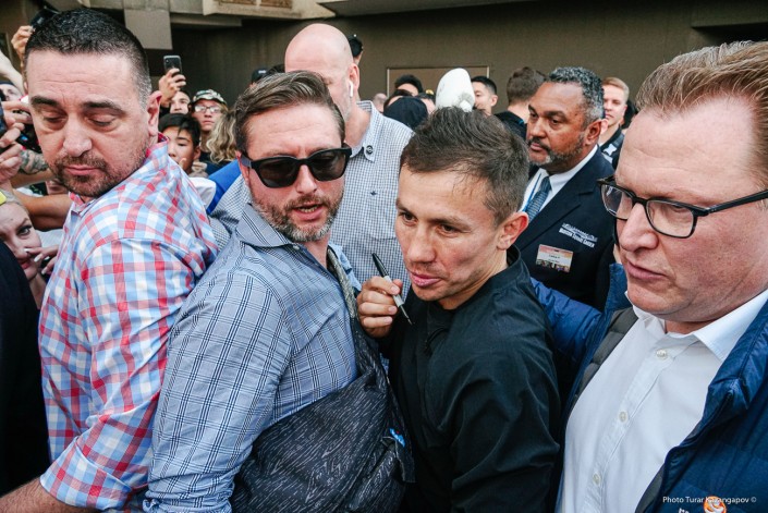 После открытой тренировки Геннадий Головкин раздал фанатам автографы. Он оставлял свою подпись на футболках, головных уборах и фотоснимках. Охотно делал селфи.