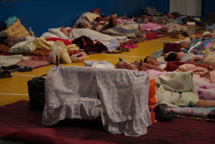 К утру в организованных для эвакуированных местах людей стало меньше. Некоторые, как эти люди на фото, решили спать прямо на улице из-за духоты в переполненных помещениях. Многие разъехались к родственникам, какая-то часть поехала обратно в Арысь в попытке прорваться через блокпост и забрать свои вещи.