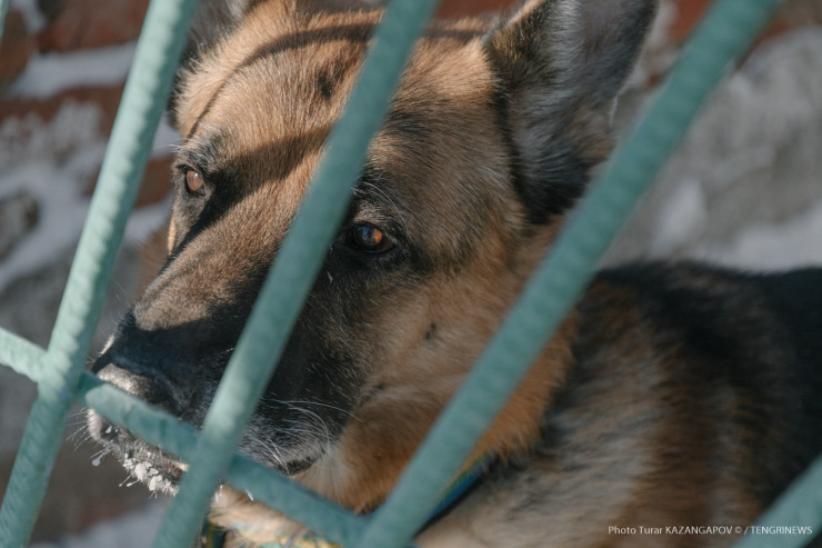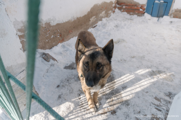 Айк - помесь немецкой и бельгийской овчарки, ему три года. Воспитывает его кинолог Данияр Жусупов.