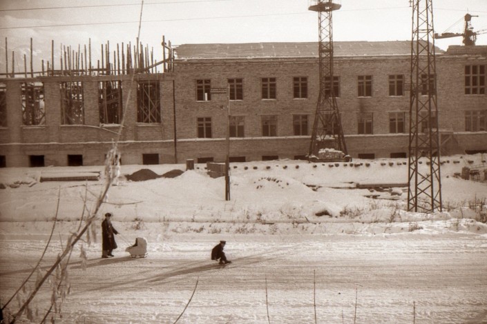 На фотографиях Алима Хайдарова запечатлены моменты создания или исчезновения ряда исторических объектов в Алматы. На этом снимке - строительство Политехнического института, ныне КазНТУ имени Сатпаева. Раньше там было кукурузное поле.