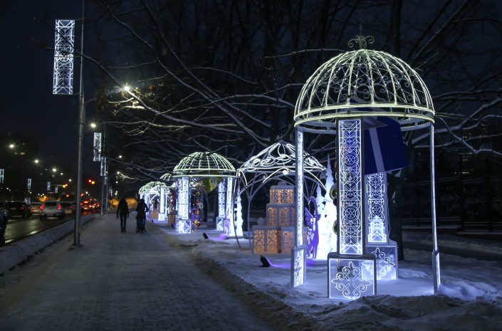 В канун Нового года Алматы засиял праздничными огнями. На улицах города появились красочные елки и необычные световые инсталляции.