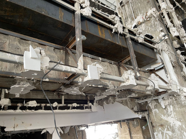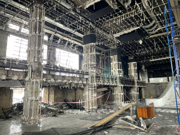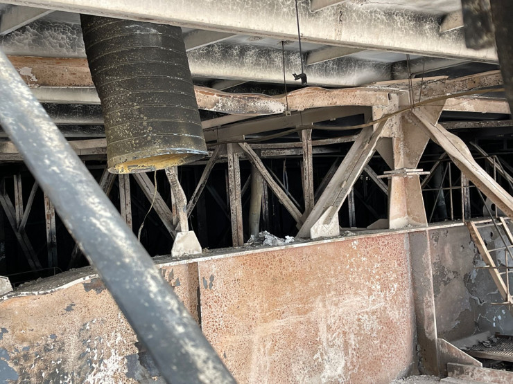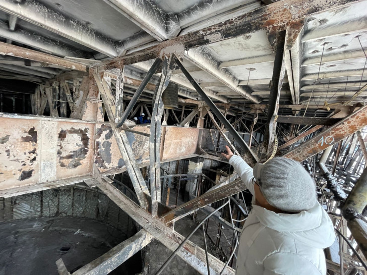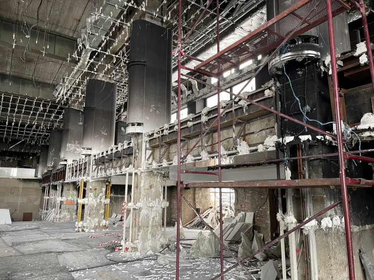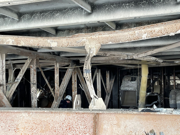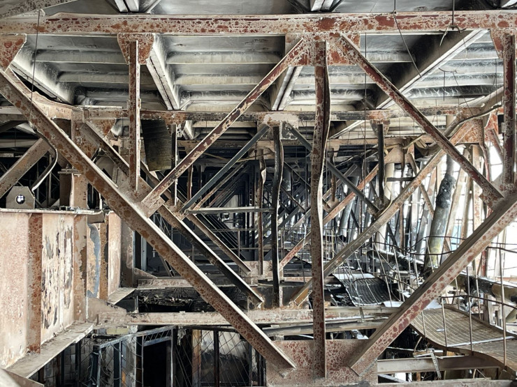 Настолько высокая температура разогрелась здесь в дни беспорядков, что несущие металлоконструкции были так повреждены.