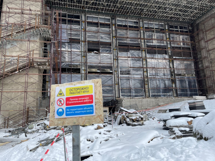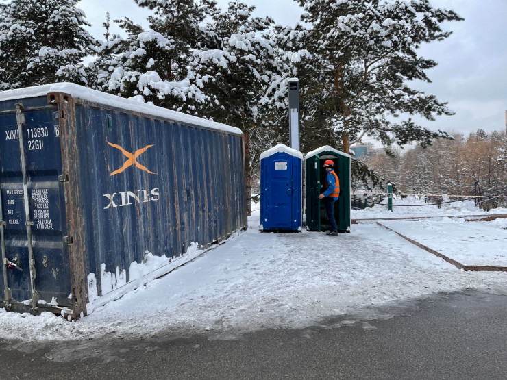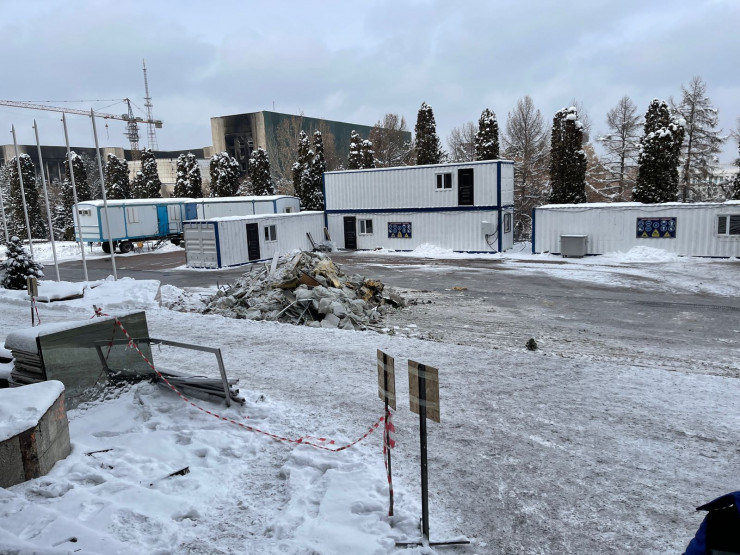 Мы вновь направились на улицу. По периметру здания временно установили теплые контейнеры. В них рабочие могут пообедать, передохнуть и набраться сил.