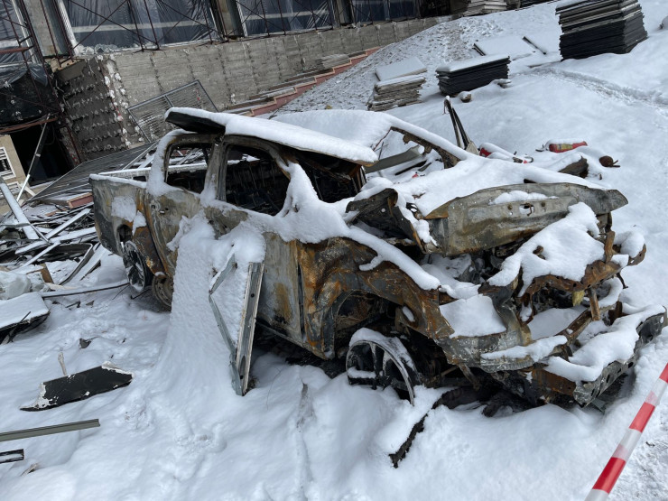 На улице среди строительного мусора можно увидеть тот самый сгоревший пикап.