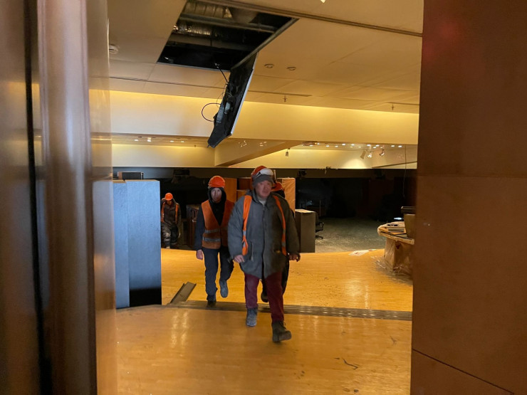 Рабочие активно передвигаются по зданию, чтобы успеть завершить свою миссию в обещанные сроки.
