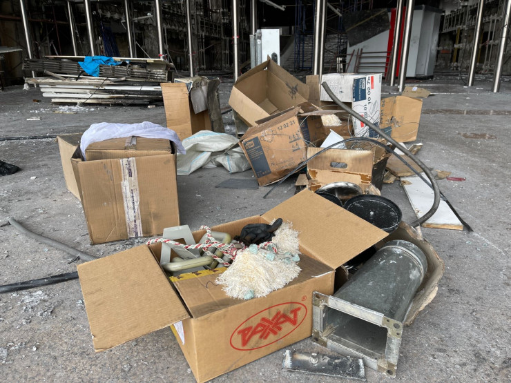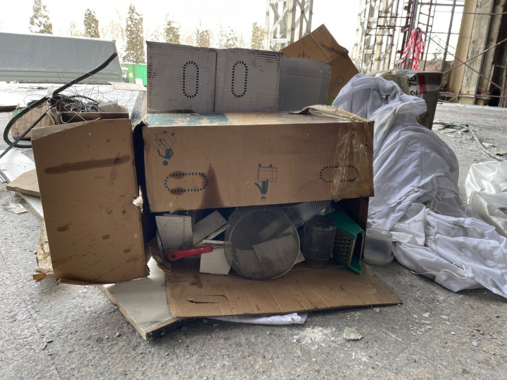 Помимо строительного мусора, перед входом лежат коробки с различными вещами, которые, судя по всему, ранее находились внутри.