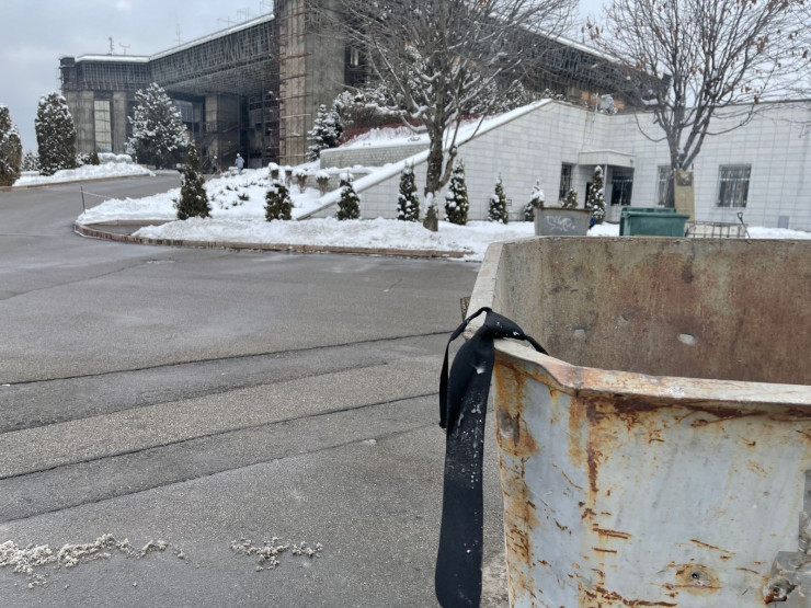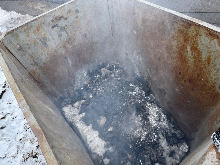 Уже на территории первым в глаза бросается мусорный бак, из которого шел небольшой дым. Внутри мы заметили остатки от сгоревшей бумаги.
