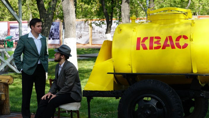 Погружение в 60-е начинается сразу же на входе в парк. Здесь расположились парни с гитарами, одетые по моде того периода.