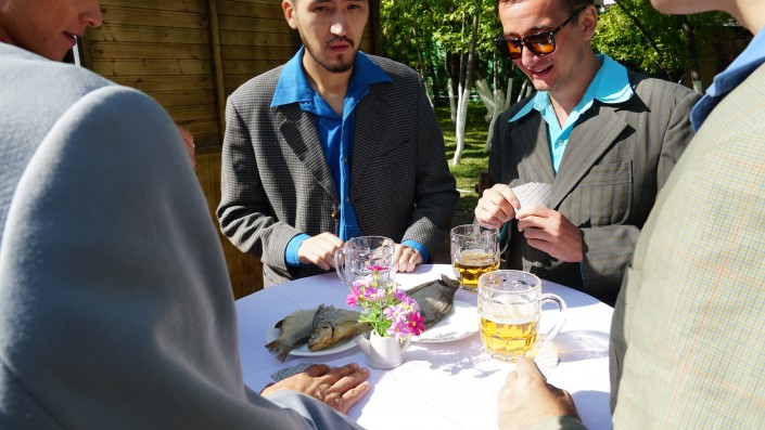 За рядом стоящими столиками хулиганистые на вид парни распивали из пивных кружек пенистые напитки и играли в "дурака".
