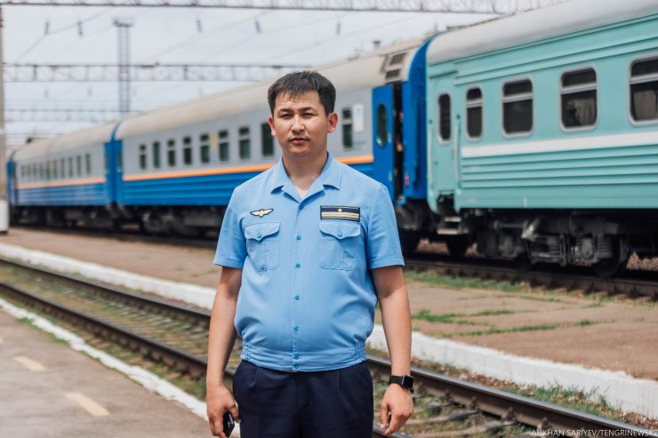 "Я родился на этой станции, вырос вдоль путей, и каждый день у нас за столом все темы были только про железную дорогу, сам я с детства мечтал стать начальником станции, как и мой дедушка. Работал и сигналистом, и составителем поездов, и дежурным по парку, и проводником практику проходил, весь запад и юг Казахстана объездил, много было всего, и каждая работа была по-своему интересна. Сейчас вот уже три года работаю начальником станции на своей родине. Супруга моя тоже из этой сферы".