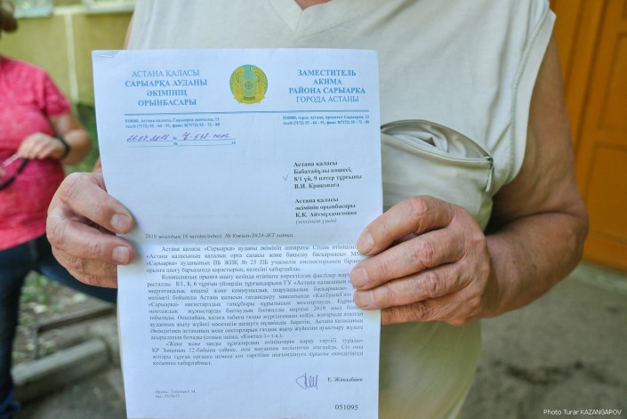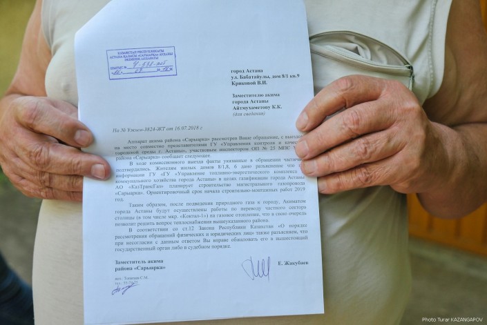 Местные жители жалуются в акимат. Вот пришел ответ из района Сарыарка. Если вкратце, жильцов уведомляют, что их проблема решится, когда в столицу проведут газопровод. Сообщается, что начнут строительство этого газопровода в 2019 году.